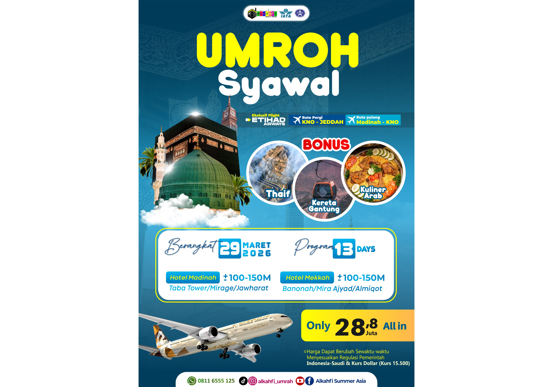Keberangkatan dijadwalkan pada 29 Maret 2026 dengan rute penerbangan Kualanamu (KNO) – Jeddah dan kepulangan melalui Madinah – KNO, sehingga jamaah dapat beribadah dengan lebih khusyuk tanpa perjalanan yang melelahkan.