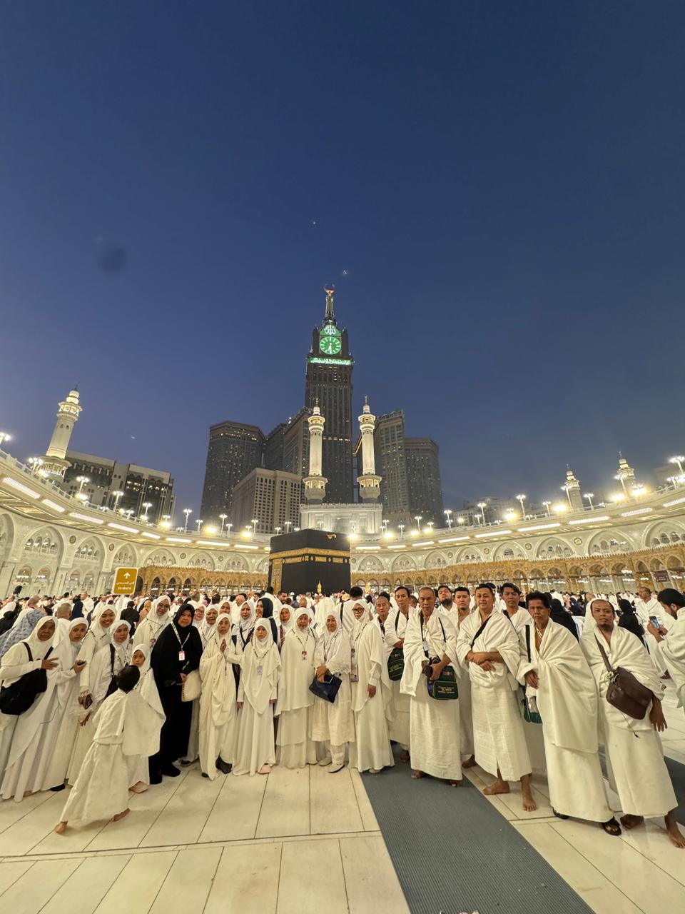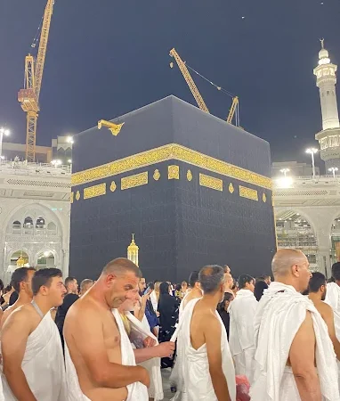 Setelah berihram, selanjutnya jemaah melakukan Thawaf yaitu mengelilingi Ka’bah sebanyak 7 kali dengan berlawanan arah jarum jam. Setiap putaran Thawaf dimulai dari Hajar Aswad. Ketika hendak melakukan Thawaf, lakukanlah Idhtiba’ bagi Jemaah laki-laki dengan meletakkan bagian lengan kain ihram di bawah pundak kanan ( di ketiak) sehingga pundak kanan terbuka (tidak tertutup kain ihram) dan dua ujungnya di atas pundak kiri. Seusai tujuh putaran Thawaf, disunnahkan untuk melakukan salat 2 raka’at di belakang Maqam Ibrahim.